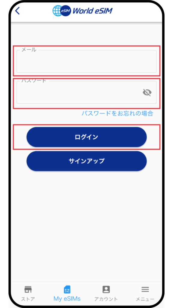 購入時に入力した「メールアドレス」と「パスワード」を入力してログインする。