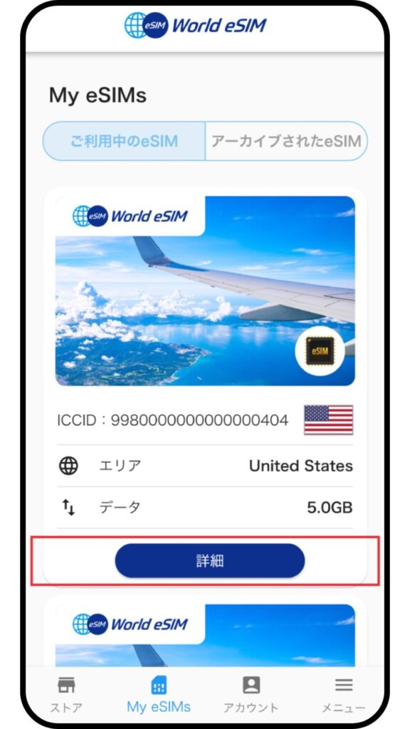 ①アプリからeSIM詳細へ