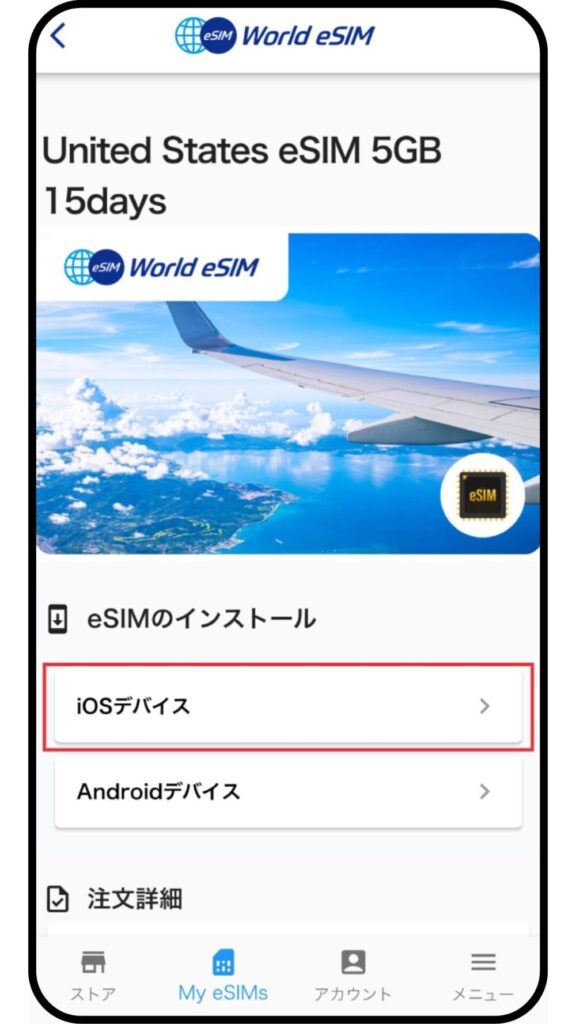 eSIMのインストール画面で「iOSデバイス」を選択します。