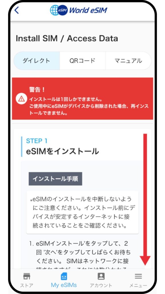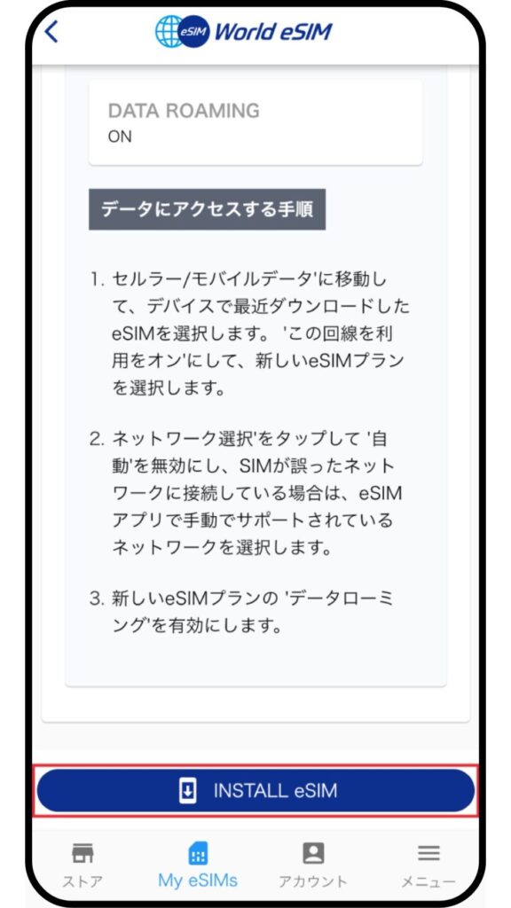 画面最下部の「インストール eSIM」ボタンをタップするとインストールが開始されます。