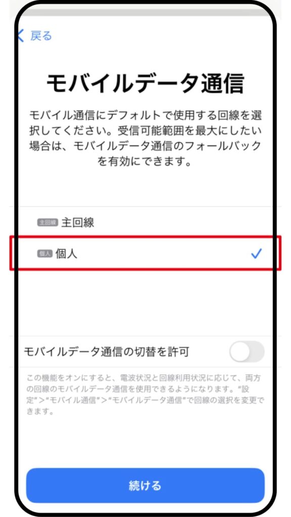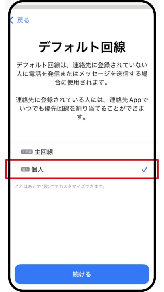デフォルト回線の「個人」を選択し「続ける」をタップ