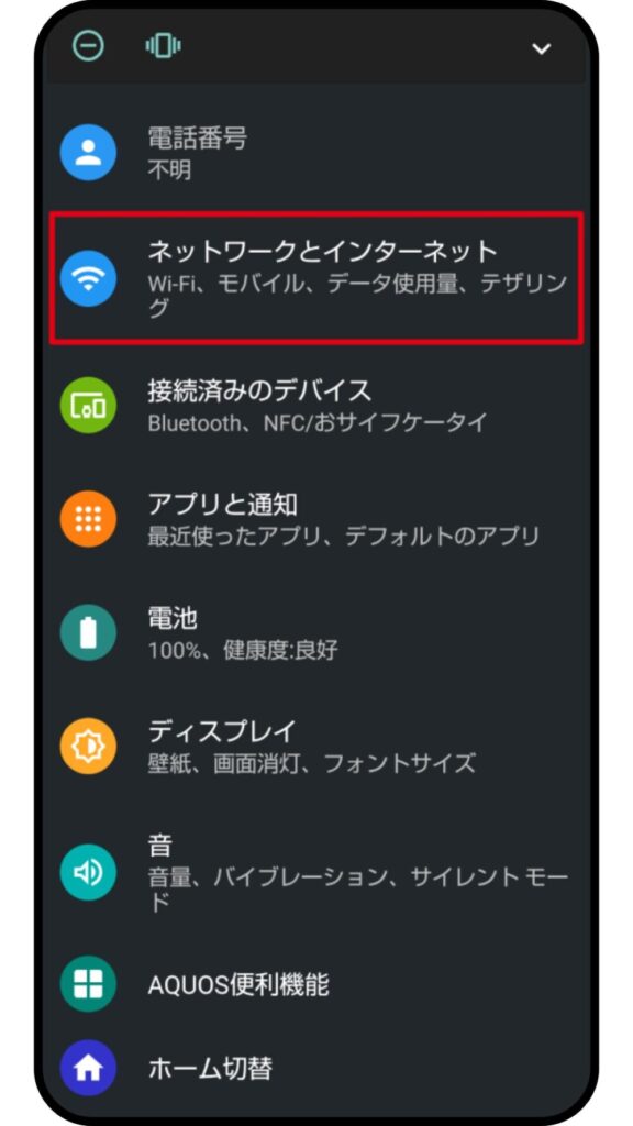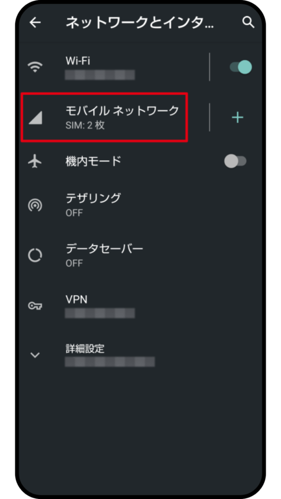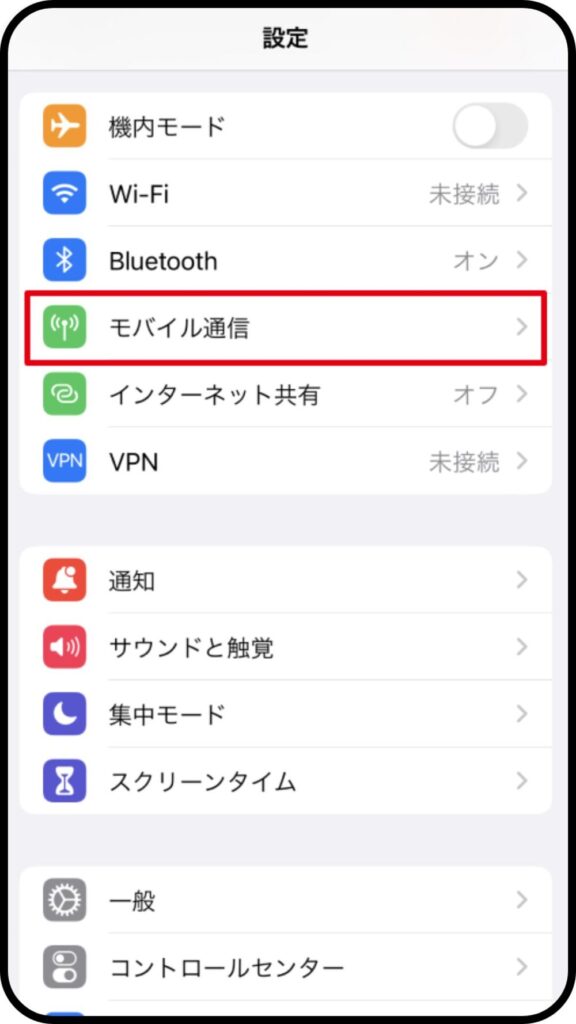 ①設定から「モバイル通信」を開く