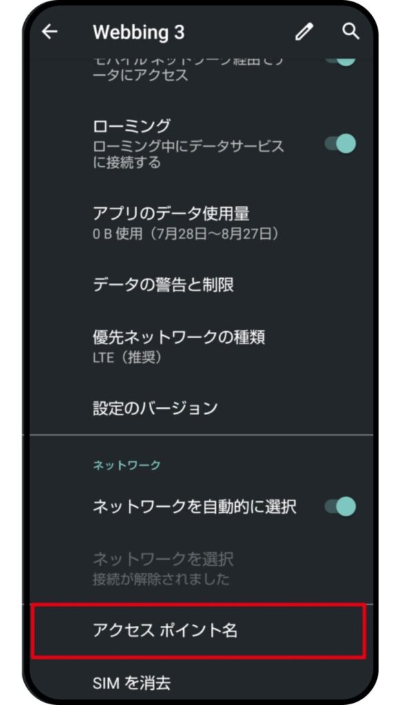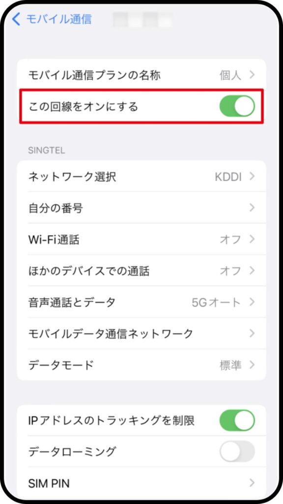 現地設定で、購入したeSIMの「データローミング」をonにすると説明しました。