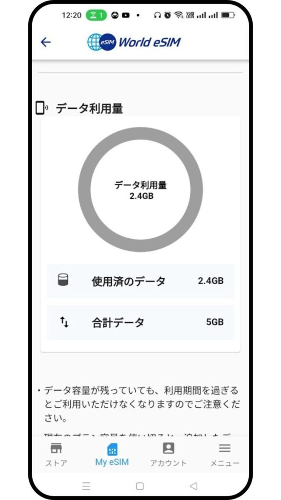 World eSIMではアプリ上でデータ使用量を確認できます。ただ一度だけ、その画面がフリーズして使用量が表示されないことがありました。